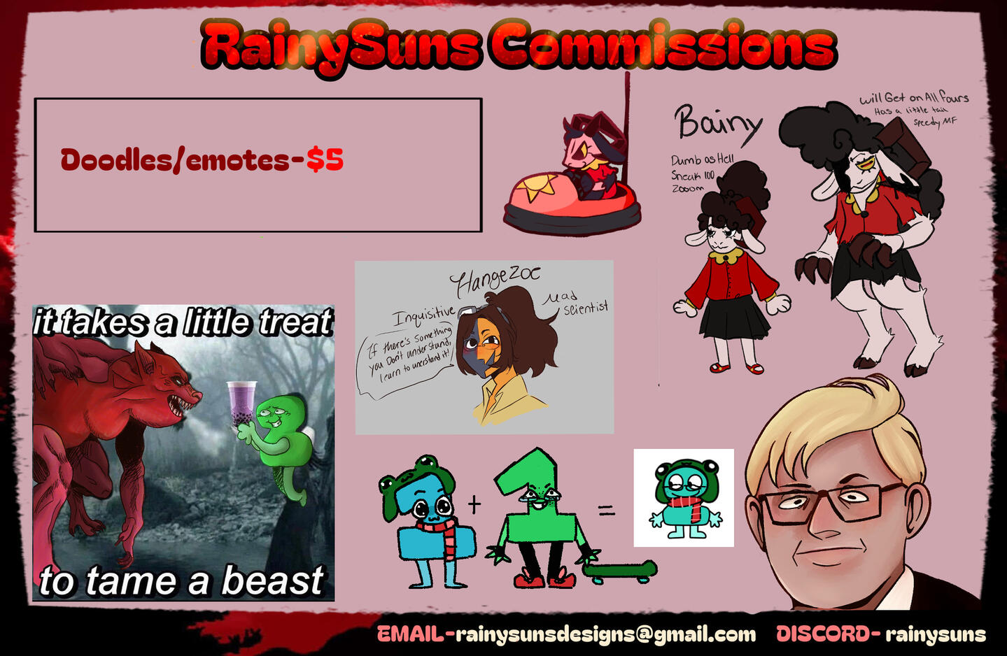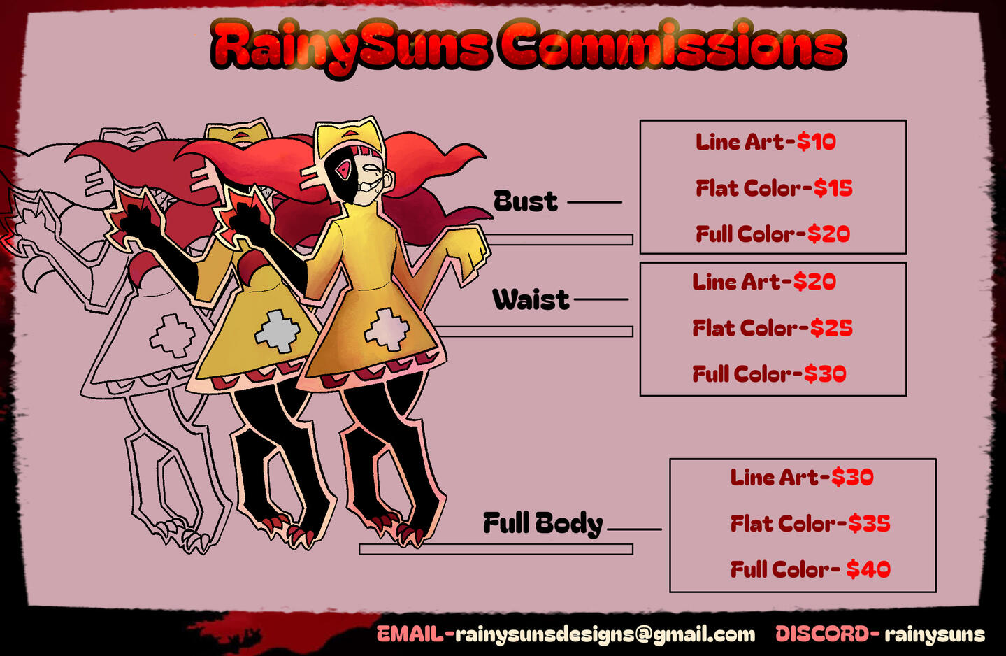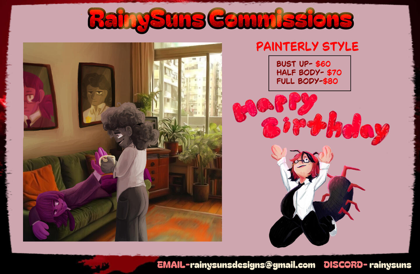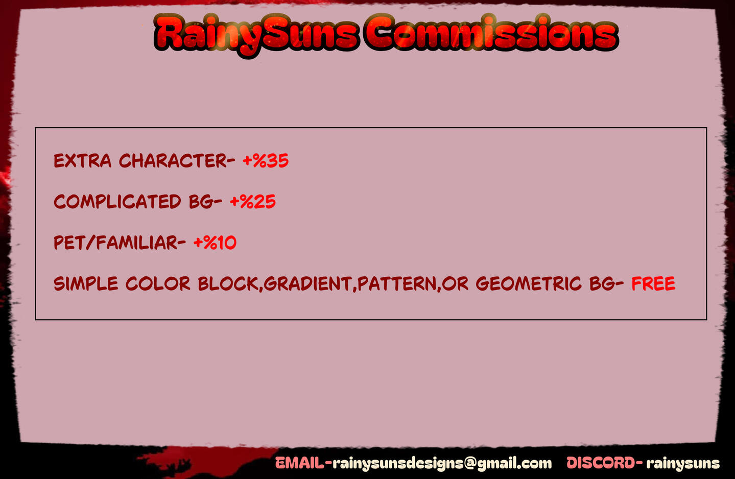 Please read the terms carefully:I, RAINYSUNS (the artist):I reserve the right to cancel and refund the order at any time for any reason.Payment can either be 100% upfront or 50% before and 50% after finished product.Only expecting payment USD and payment through PayPal.I retain all copyrights over the commissioned artwork.I will NOT claim the intellectual property (IP) of the commissioned artwork.I will NOT profit further from the commissioned artwork unless you (the customer) break any of the terms.I reserve the right to post the commissioned artwork online, in my portfolio as well as in publications such as art books.You (the customer/commissioner):You may upload the commissioned artwork on any website and social channels with proper credit.You may NOT make profits from the commissioned piece (reselling, redistributing, uploading to POD-services, make prints, etc.) Unless this is discussed prior to commissioning me.You may NOT alter the commissioned artwork without my (the artist's) consent.You MAY be allowed to sell the artwork if it is a part of a product. Must be discussed with me prior to paying for the artwork.You retain the rights to the intellectual property (IP).